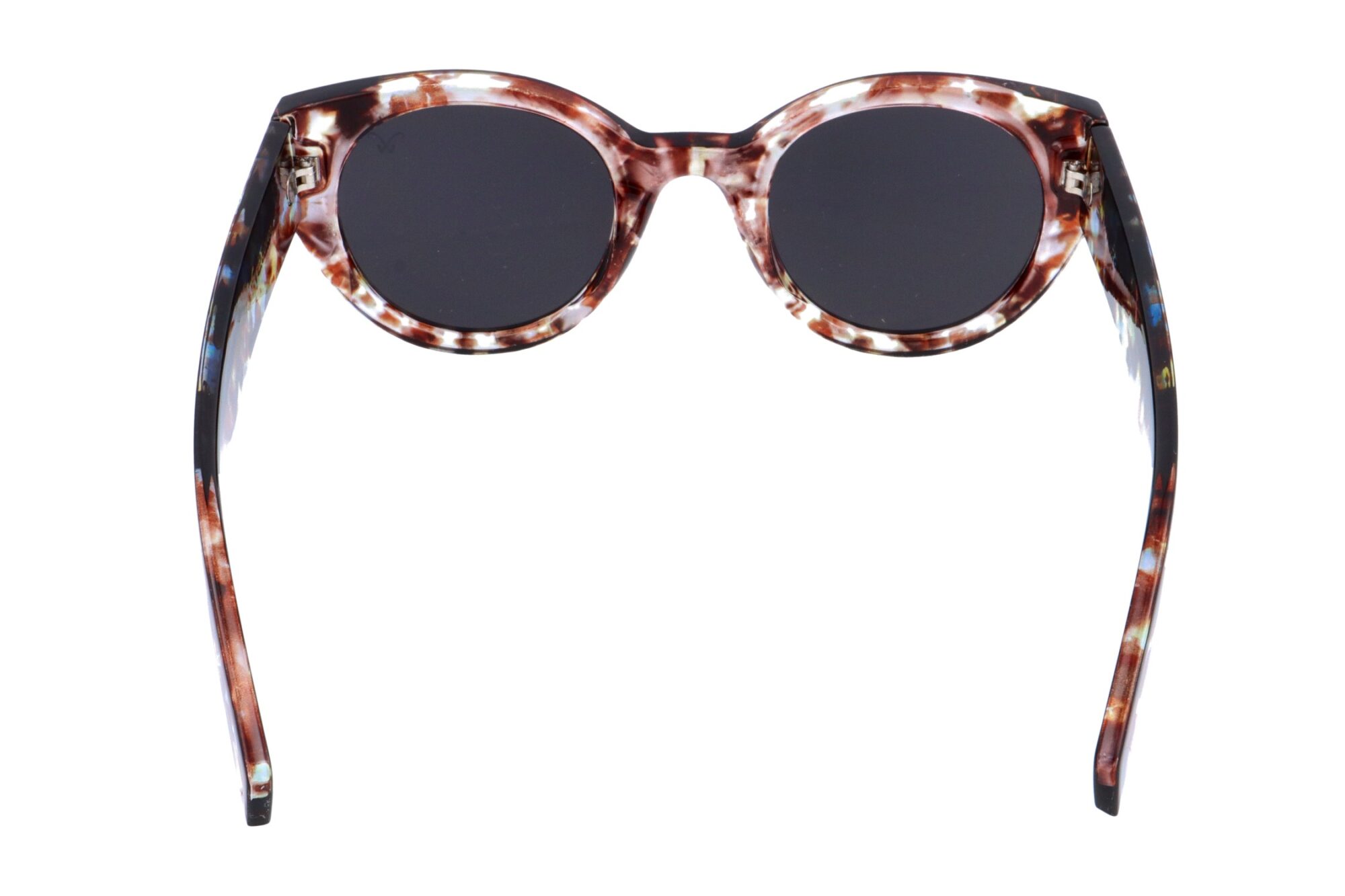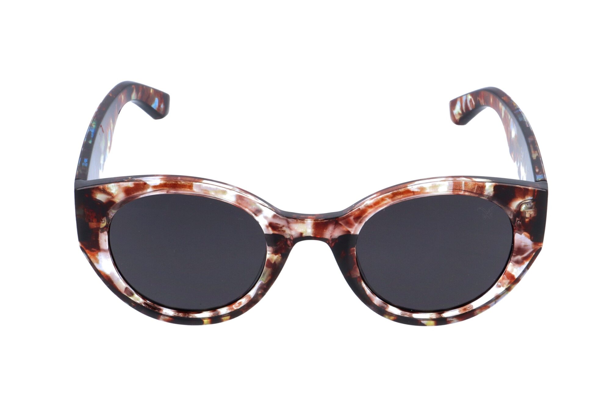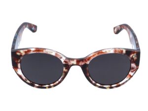 - Semi-transparent patterned frame and extra wide temples in three variants.
